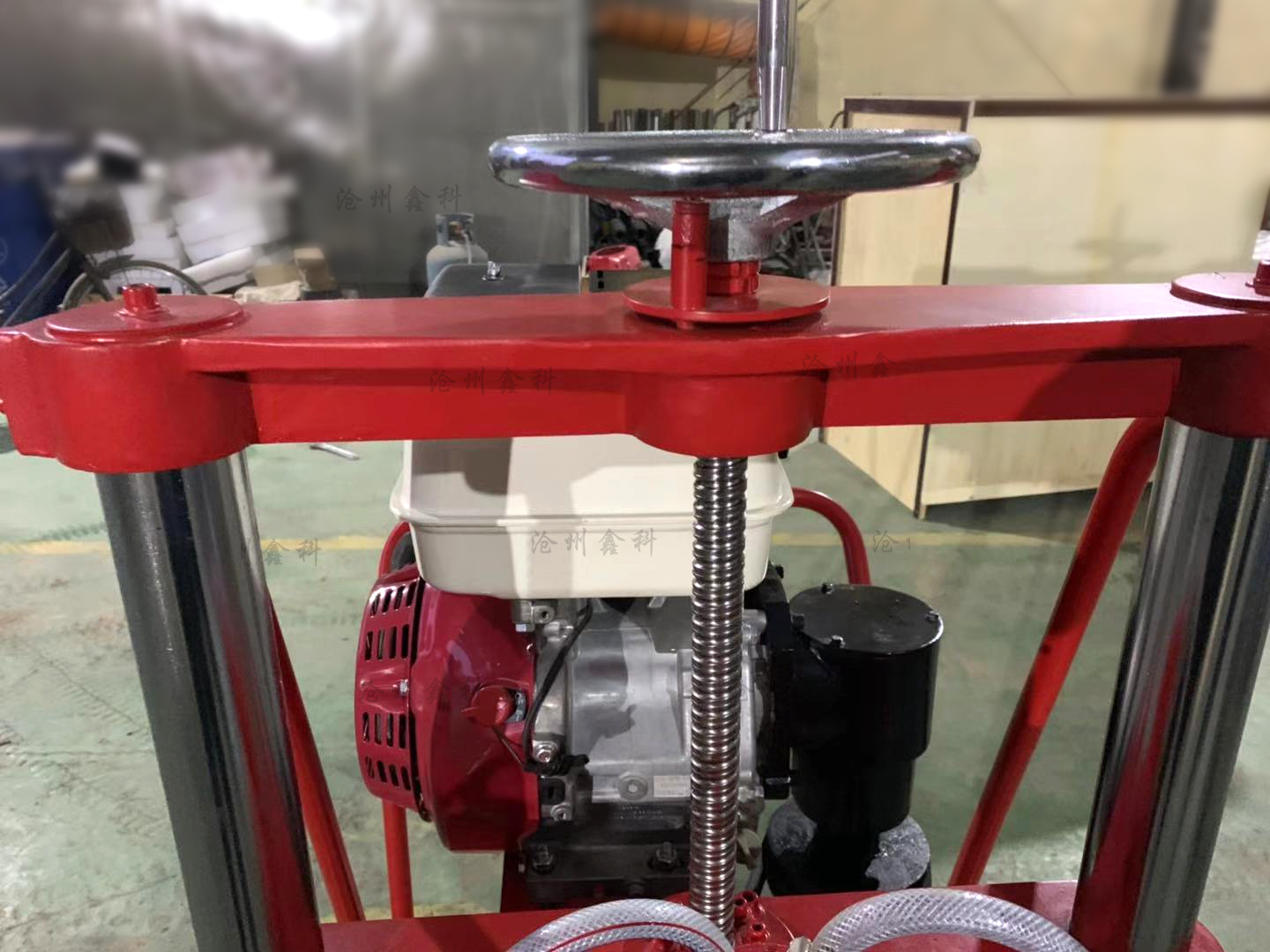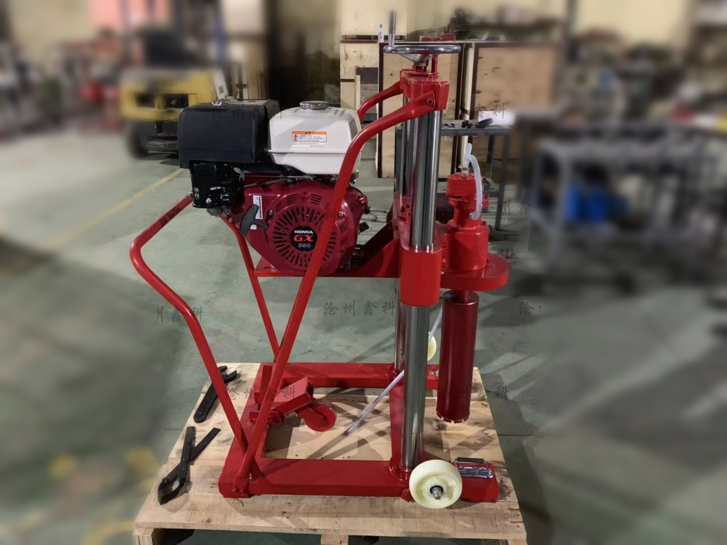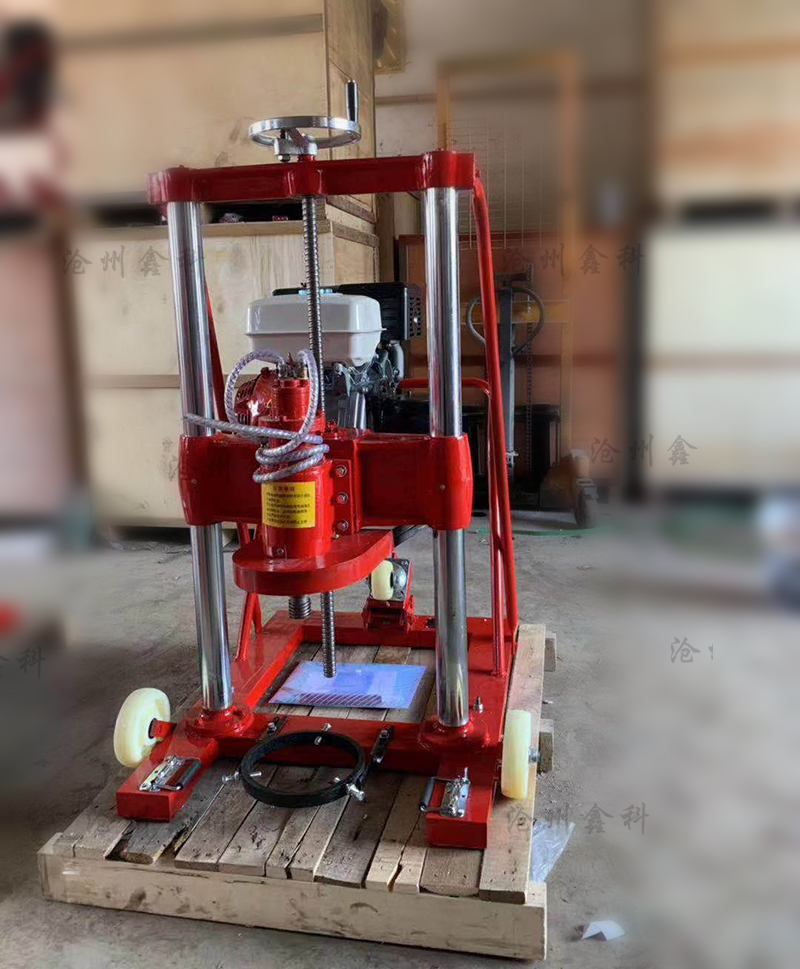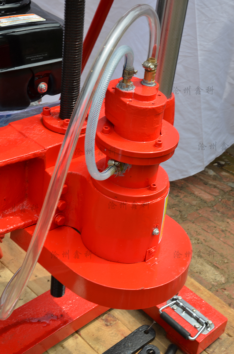 5、開孔:以上作業(yè)做好后,即可開孔作業(yè),裝上鉆頭,起動(dòng)汽油機(jī)(詳情見汽油機(jī)用戶手冊)把進(jìn)水管放入水桶內(nèi),水桶要提到高出水泵位置,然后手捏氣襄把水吸入水泵,水泵上水后把水桶放在地面即可。油門調(diào)至z大,開始輕搖給進(jìn)手柄,使鉆頭緩慢接觸地面。開孔要訣:先給水后鉆進(jìn),給進(jìn)速度要慢,鉆壓要小。嚴(yán)禁無水作業(yè),以免燒壞鉆頭和水封。